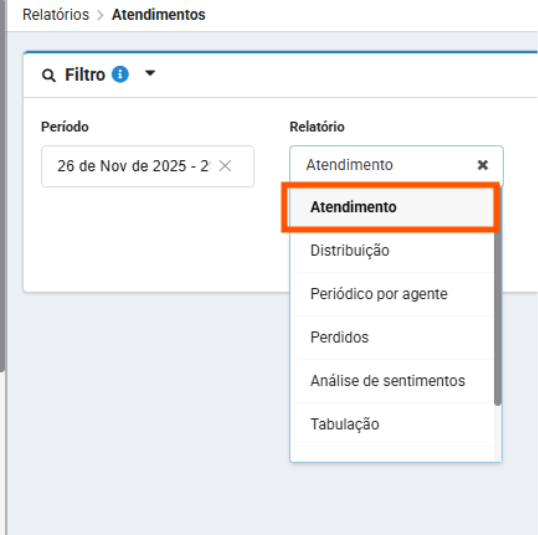 Relatório: contém os tipos de relatórios diferentes, que podem ser visualizados individualmente ao serem selecionados. No nosso caso, deixaremos o de Atendimento selecionado.