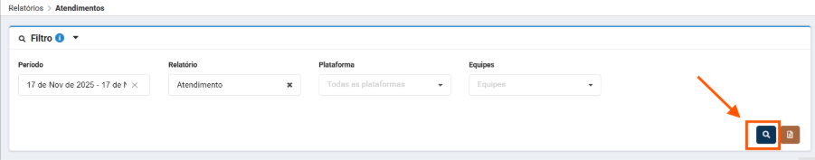 Ao selecionar o Período desejado e escolher a opção Atendimento em Relatório, clique no ícone de lupa à direita para gerar o relatório: