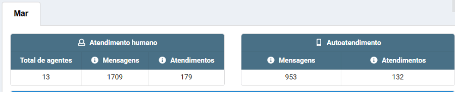 Mensagens: Tanto em atendimento humano quanto em autoatendimento, temos o item Mensagens, que se refere ao número total de mensagens trocadas durante os atendimentos.