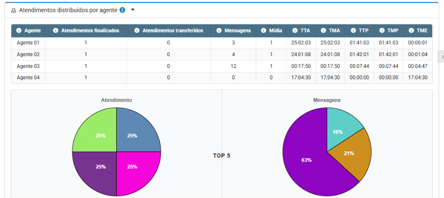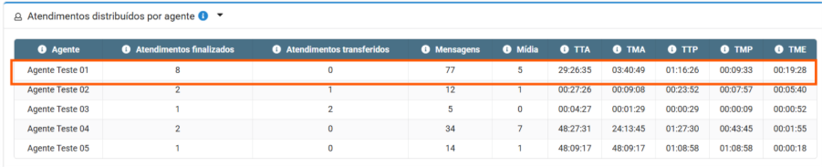 Na sequência, temos a sessão de Atendimentos distribuídos por agente, onde todos os valores apresentados correspondem exclusivamente às ações e interações realizadas por cada agente individualmente: