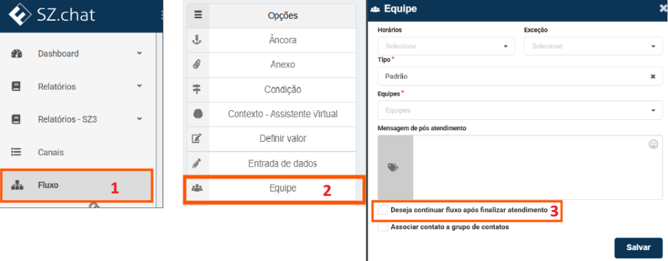 Ao acessar a opção Fluxo no menu lateral do SZ.chat, entrar em um fluxo e selecionar o Componente Equipe, é possível visualizar o campo “Deseja continuar fluxo após finalizar atendimento”: