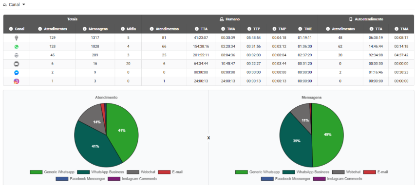Totais: Quantidade de atendimentos (inclui os finalizados com sucesso e os perdidos), mensagens trocadas e mídias trafegadas em cada canal.