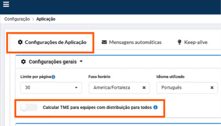 Vá até a aba Configurações de Aplicação e Localize a opção Calcular TME para equipes com distribuição para todos: