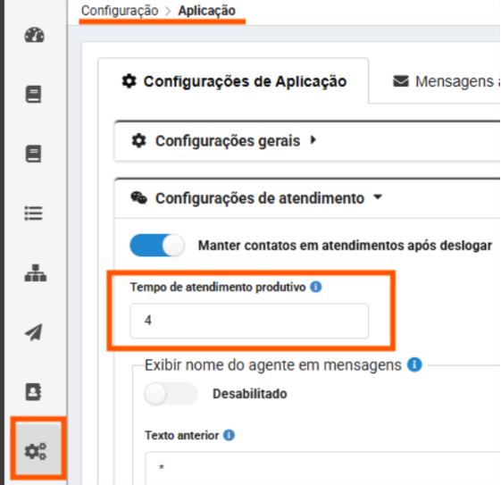 - TTP (Tempo Total Produtivo): Corresponde ao total do tempo efetivamente produtivo do atendimento dentro do canal, considerando apenas os períodos de interação ativa entre agente e cliente. O sistema desconsidera na contagem do TTP automaticamente os intervalos de inatividade que ultrapassam a tolerância configurada. O tempo de inatividade considerado tolerável pode ser ajustado em Configuração > Aplicação > Configurações de Atendimento: