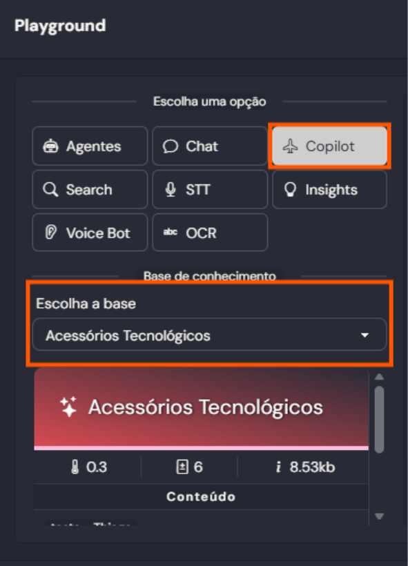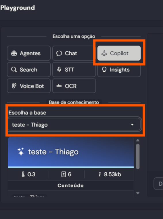 3.1. Para utilizar o Copilot dentro do Playground, é preciso selecionar a opção Copilot e a base de conhecimento desejada: