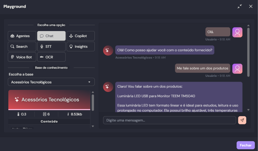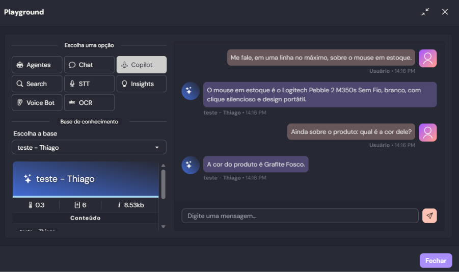 Copilot: De forma semelhante ao Chat, permite testar uma base de conhecimento para responder perguntas. No entanto, diferentemente do Chat, não possui ‘’memória’’ e, portanto, não armazena o contexto das conversas.