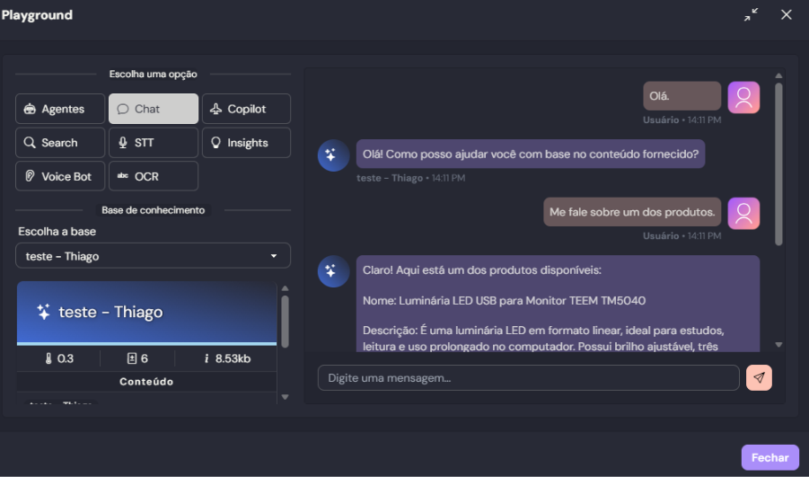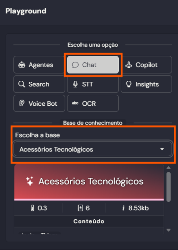 2.1. Para utilizar o Chat dentro do Playground, é preciso selecionar a opção Chat e a base de conhecimento desejada: