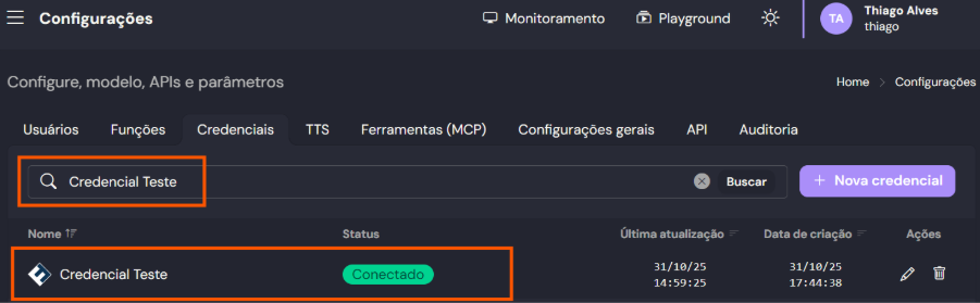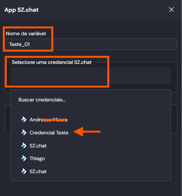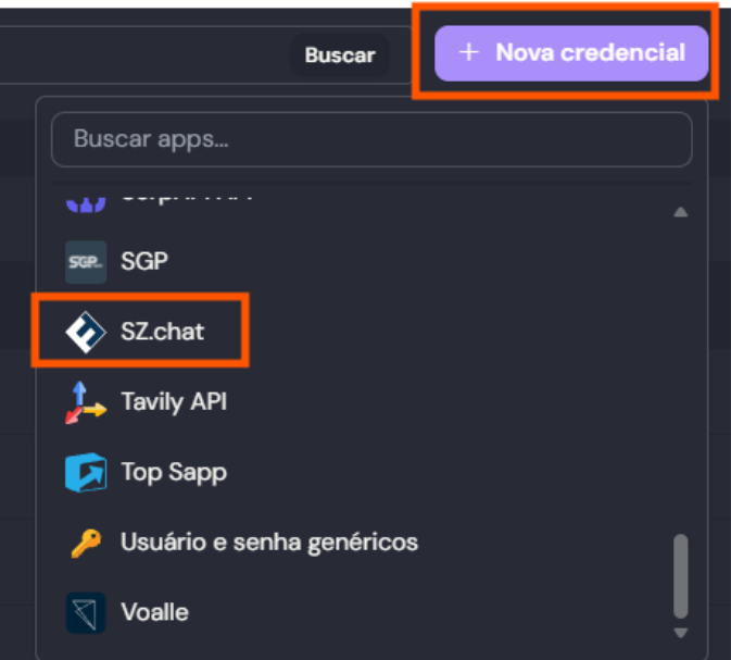 1.Para configurar uma credencial do SZ.chat, acesse Configurações > Credenciais > Nova credencial: