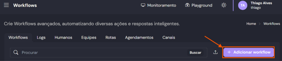 3.Edite um workflow já existente, ou, crie um novo workflow clicando no botão Adicionar workflow localizado no canto superior direito da tela: