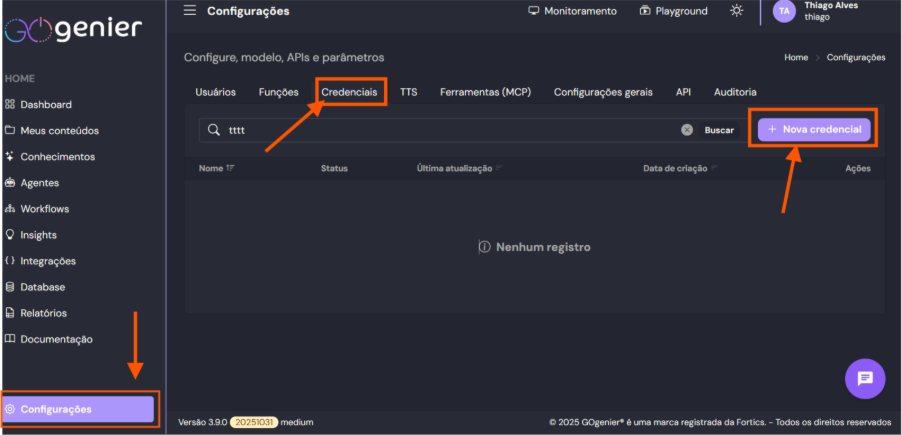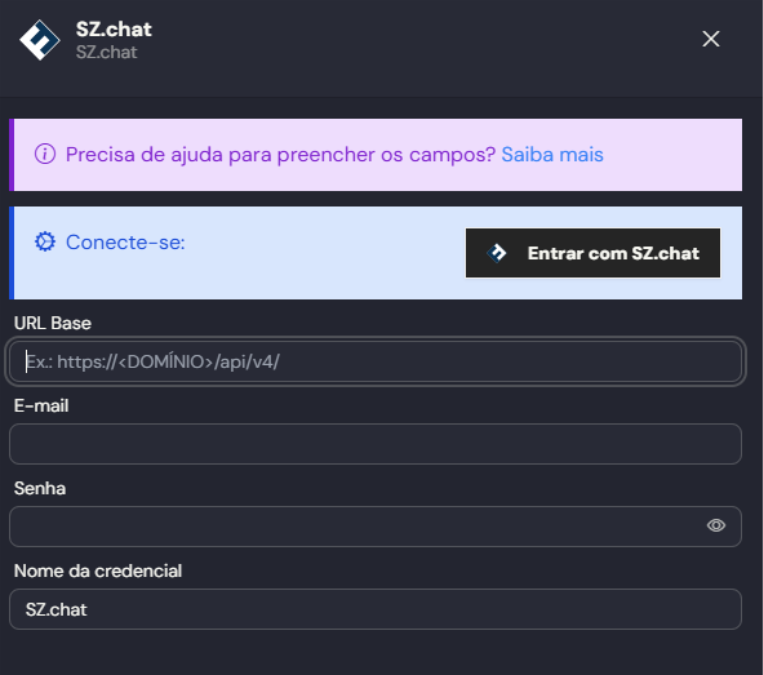 Antes de começar, é necessário criar uma credencial para utilizar a integração com o SZ.chat. Se você já possui uma credencial configurada no Gogenier, siga diretamente para o passo 2.