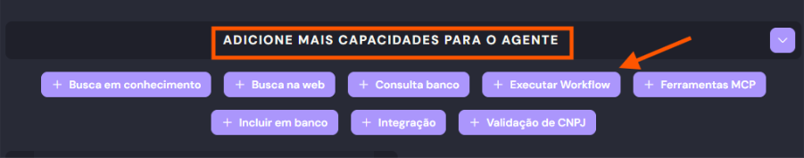 Dentro das configurações do agente, basta rolar a tela até o final, clicar na opção adicione mais capacidades para o agente + e em seguida selecionar + Executar workflow: