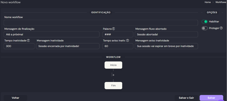 Nome workflow: informe o nome que deseja atribuir ao workflow.