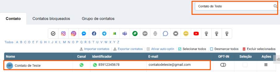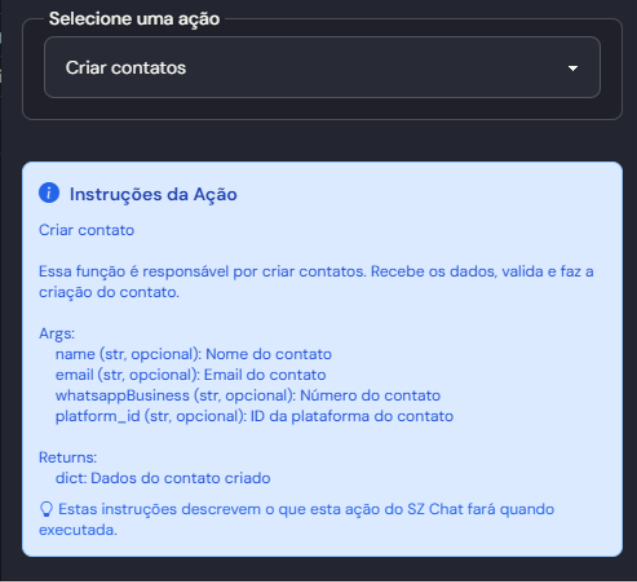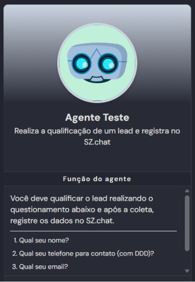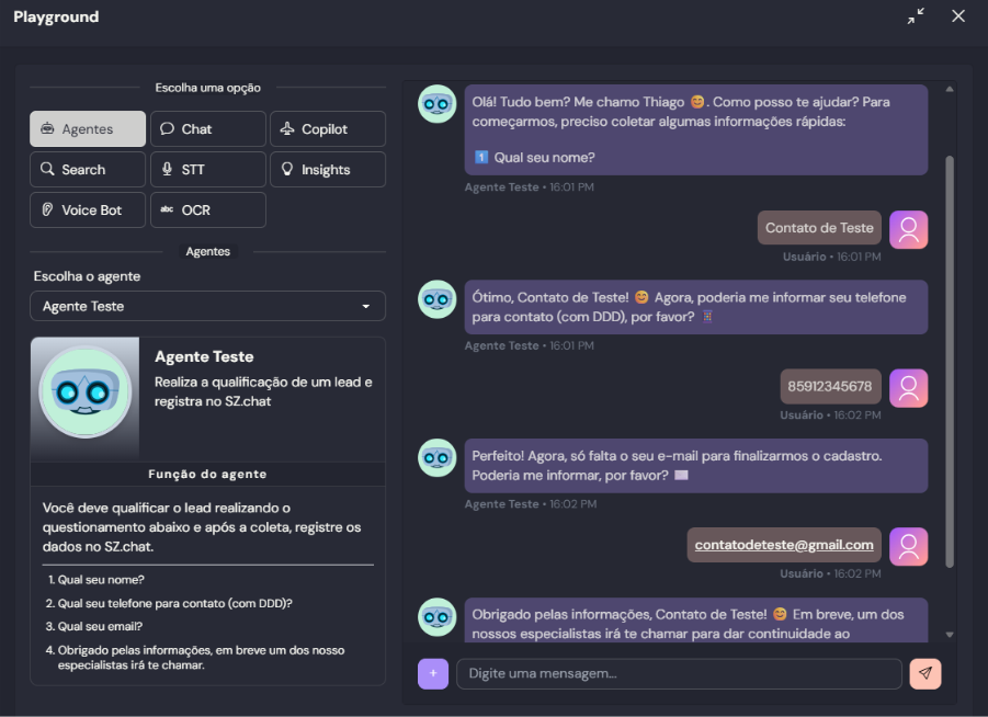 Com o agente configurado, podemos testar e verificar se ele está criando corretamente um contato no SZ.chat com as informações fornecidas.
