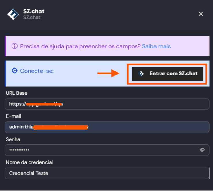 1.3. Após preencher as informações, clique em Entrar com SZ.chat para se conectar e confirmar que suas credenciais foram validadas: