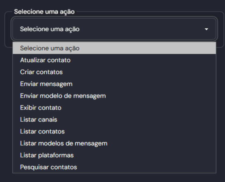 7. No campo, selecione uma ação temos as opções que podemos escolher para integrarmos com o SZ: